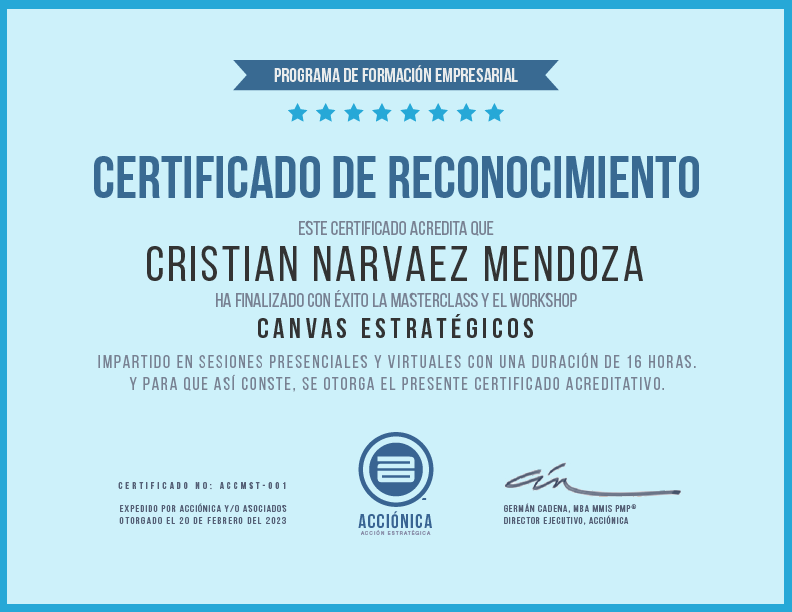 Mi experiencia al recibir asesoría estratégica y formación de ACCIÓNICA ha sido muy positiva y me ha ayudado a iniciar otro negocio digital. En los cursos recibo valiosa información para ir mejorando el uso de la plataforma web que utilizo y cómo implementar nuevas tecnologías como realidad virtual e inteligencia artificial.